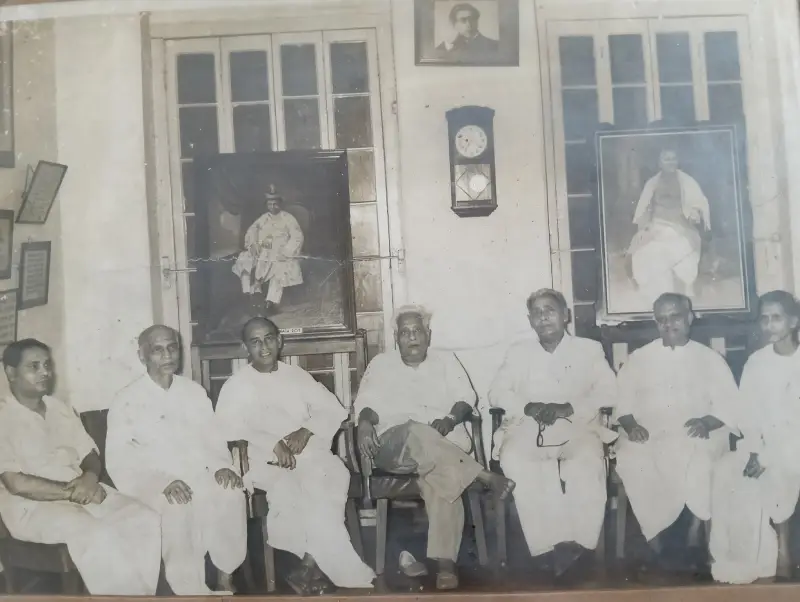 Left to Right: Mr. Anil Krishna Paul,Mr. D. N. Banerjee, Mr. B.K. Guha, Scientist Satyendra Nath Bose, Dr. Nalini Ranjan Sengupta, Mr. Khirod Chandra Paul, Mr. Jagannath Roy
